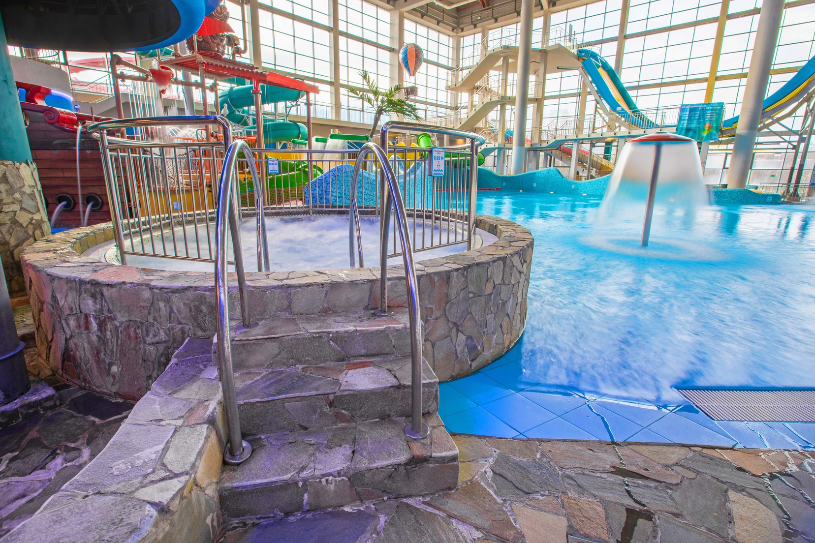 11 водных горок, 3 детские зоны, большой волновой бассейн, теплая голубая лагуна с контрастными душами и гидромассажем, джакузи, большая летняя терраса, уютное кафе с банкетными комнатами и тематические фотозоны, позволяют окунуться в атмосферу курортного отдыха без перелёта.