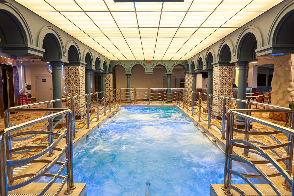 В «Термах Мореон» расположены русские парные, турецкие хаммамы, восточные аромасауны. Главное украшение и гордость банного комплекса – двухуровневый бассейн-лабиринт с реверсивным течением, водопадами и контрастными ваннами.